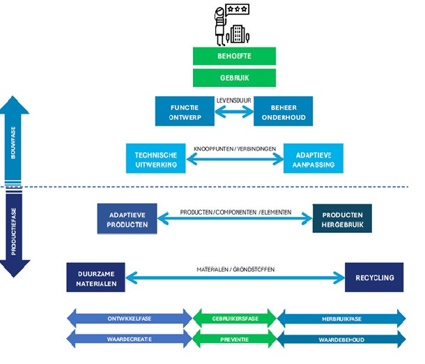 Als je losmaakbaar wilt werken zul je per ambitieniveau stappen moeten zetten. Die zien er dan telkens weer anders uit. In de productiefase heeft de producent een belangrijke verantwoordelijkheid om te zorgen voor materialen die gerecycled (kunnen) worden en producten die hergebruikt (kunnen) worden.